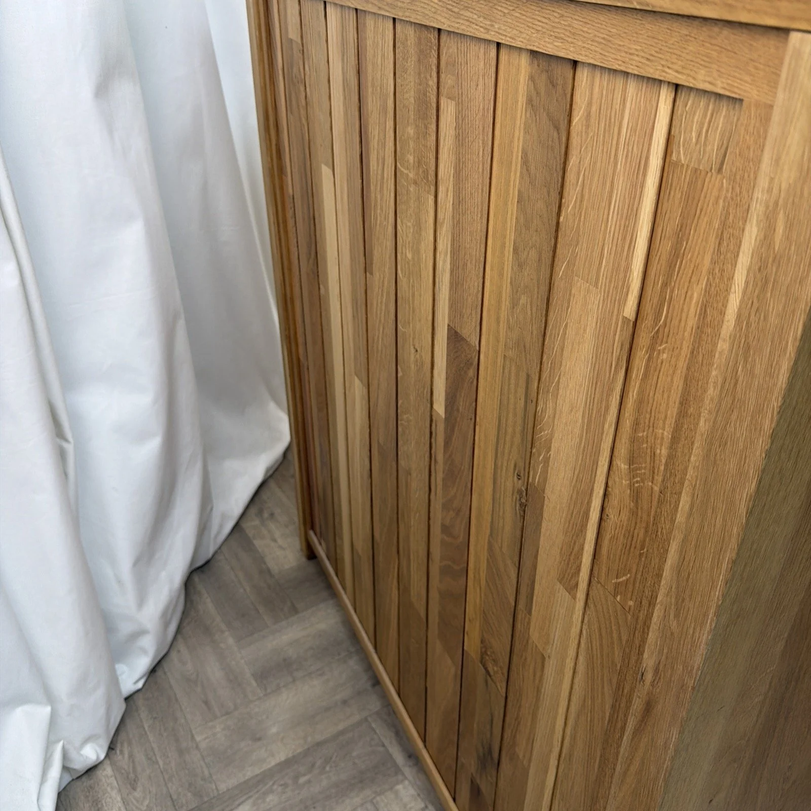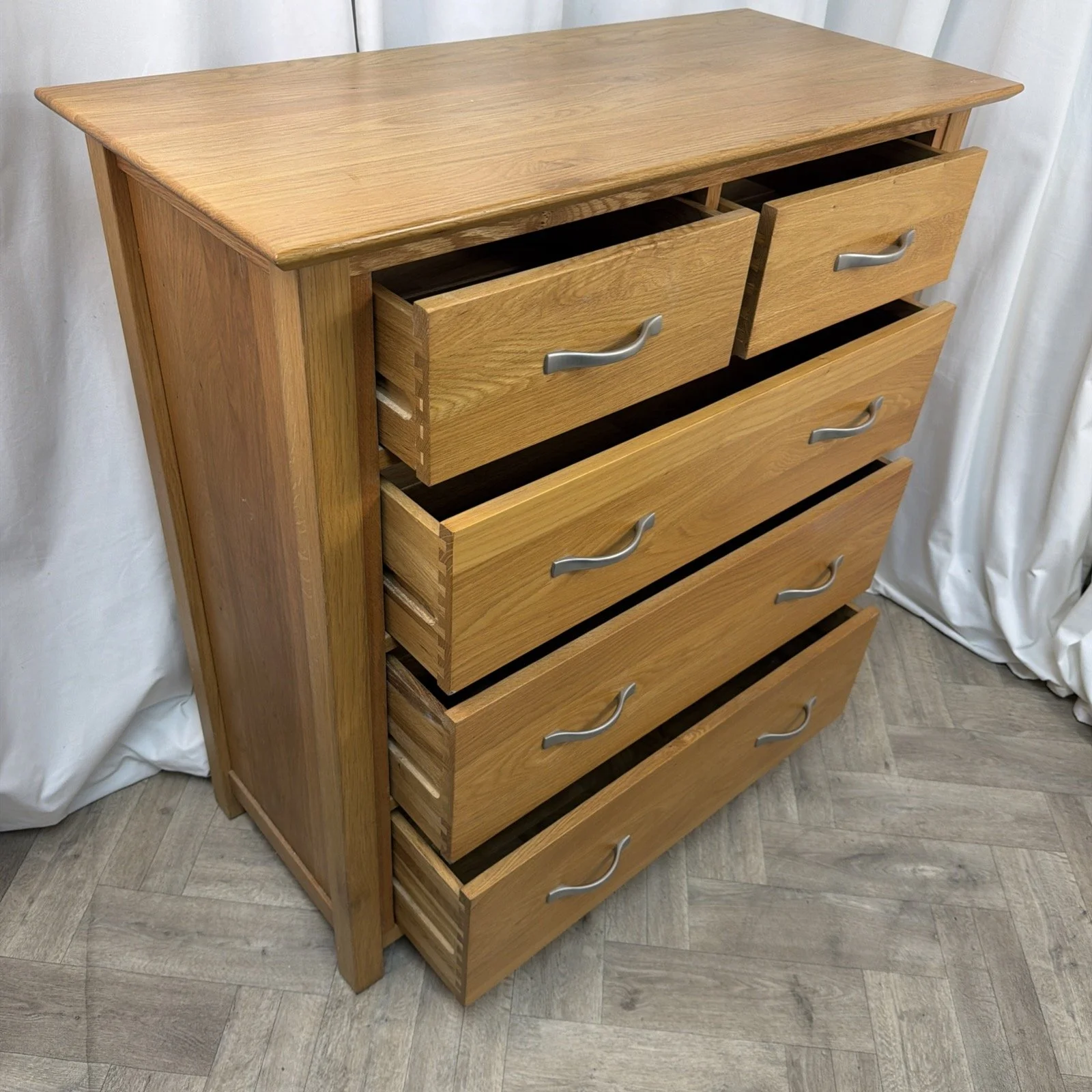 This solid oak chest of drawers has been built to the highest standard. The drawers are solid oak with oak bottoms with dove tail joins and the back is solid oak, an example of the craftsmanship. This retailed at £799 and had very little use. No signs of wear, almost showroom condition.