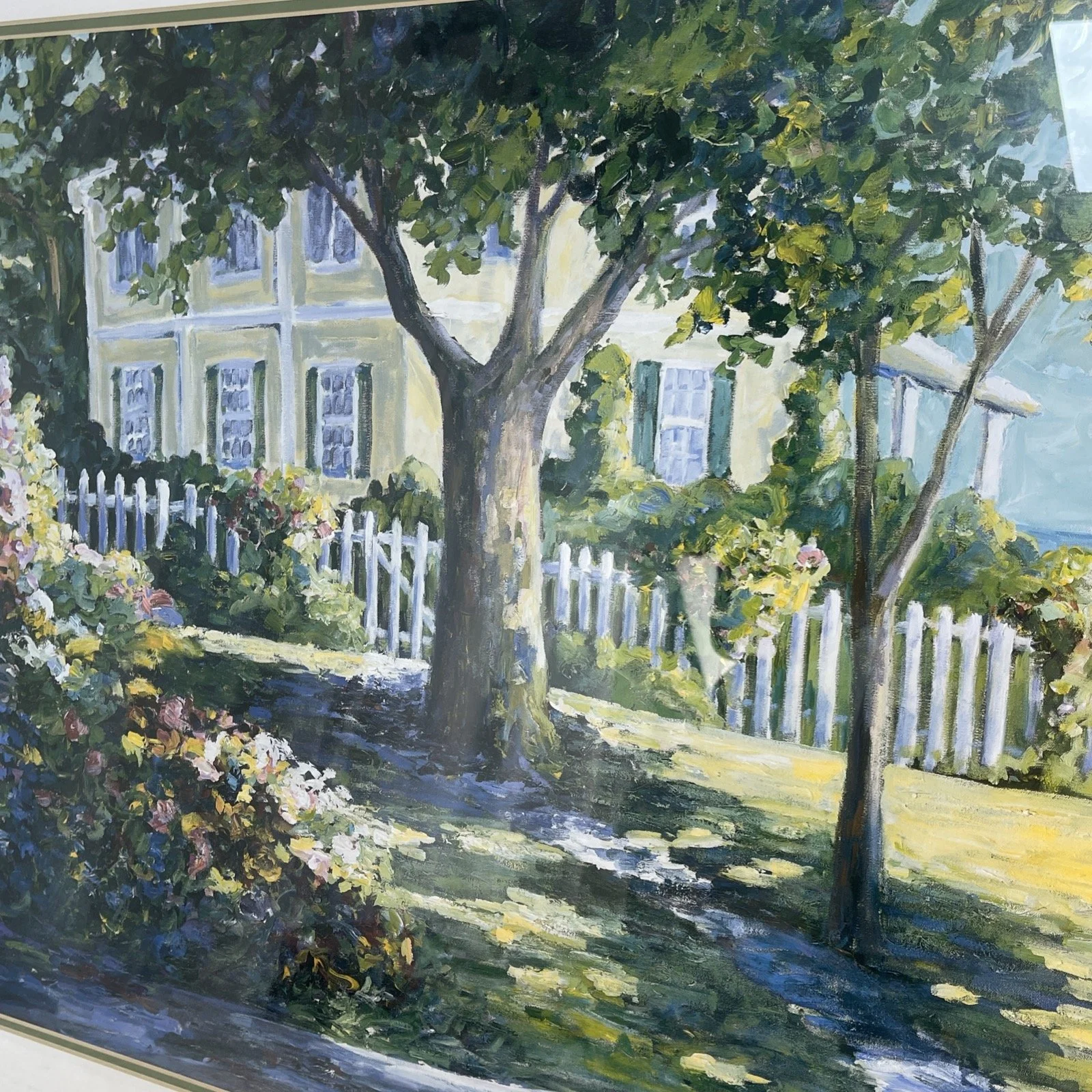 A gorgeous huge print of a painting known as Garden Path by artist Nell Revel Smith. This beautiful print sits behind a mount and framed with glass front. An amazing size approximately 80x70cm making this a real eye catcher. The summery vibe of the little yellow coastal cottage set in the idillic country garden lights up the room and brings a fresh outside feel. This really is a stunning picture.
