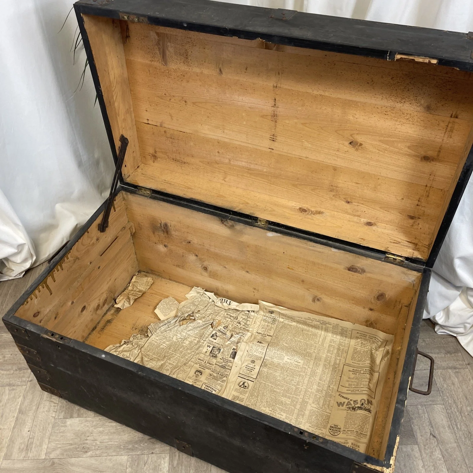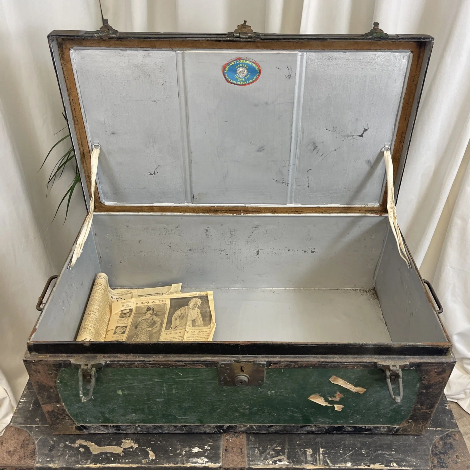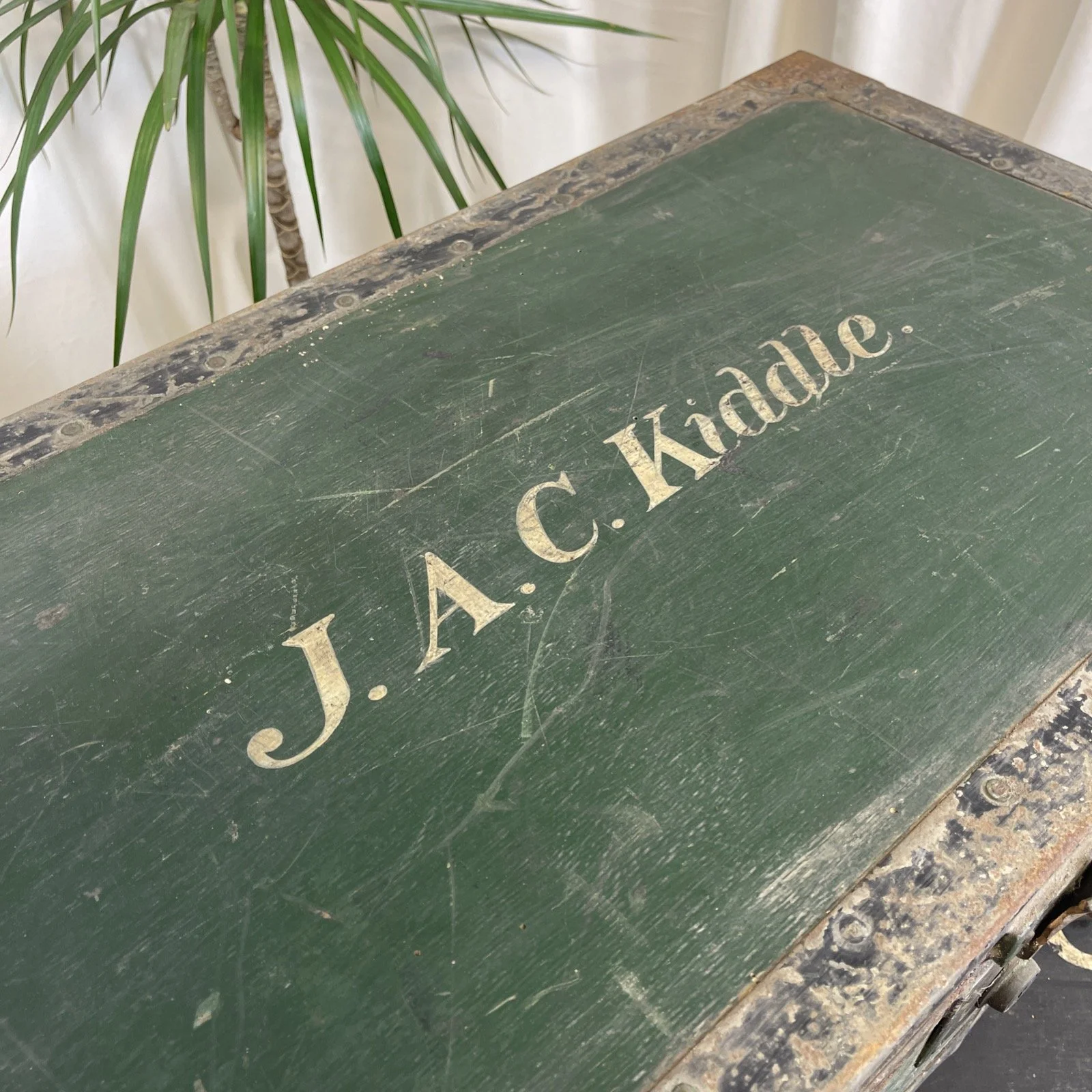 These 2 stunning luggage trunks belonged to Lieutenant J.A.C Kiddle. Both trunks are from WW1 and we thought we would keep them together as one lot. These are perfect for World War collectors and historians. Display your items in your shop or use at home. Both have obvious signs of wear due to age but still display nicely. The smaller green trunk is metal lined and has two main locks which work perfectly. The central lock does not.